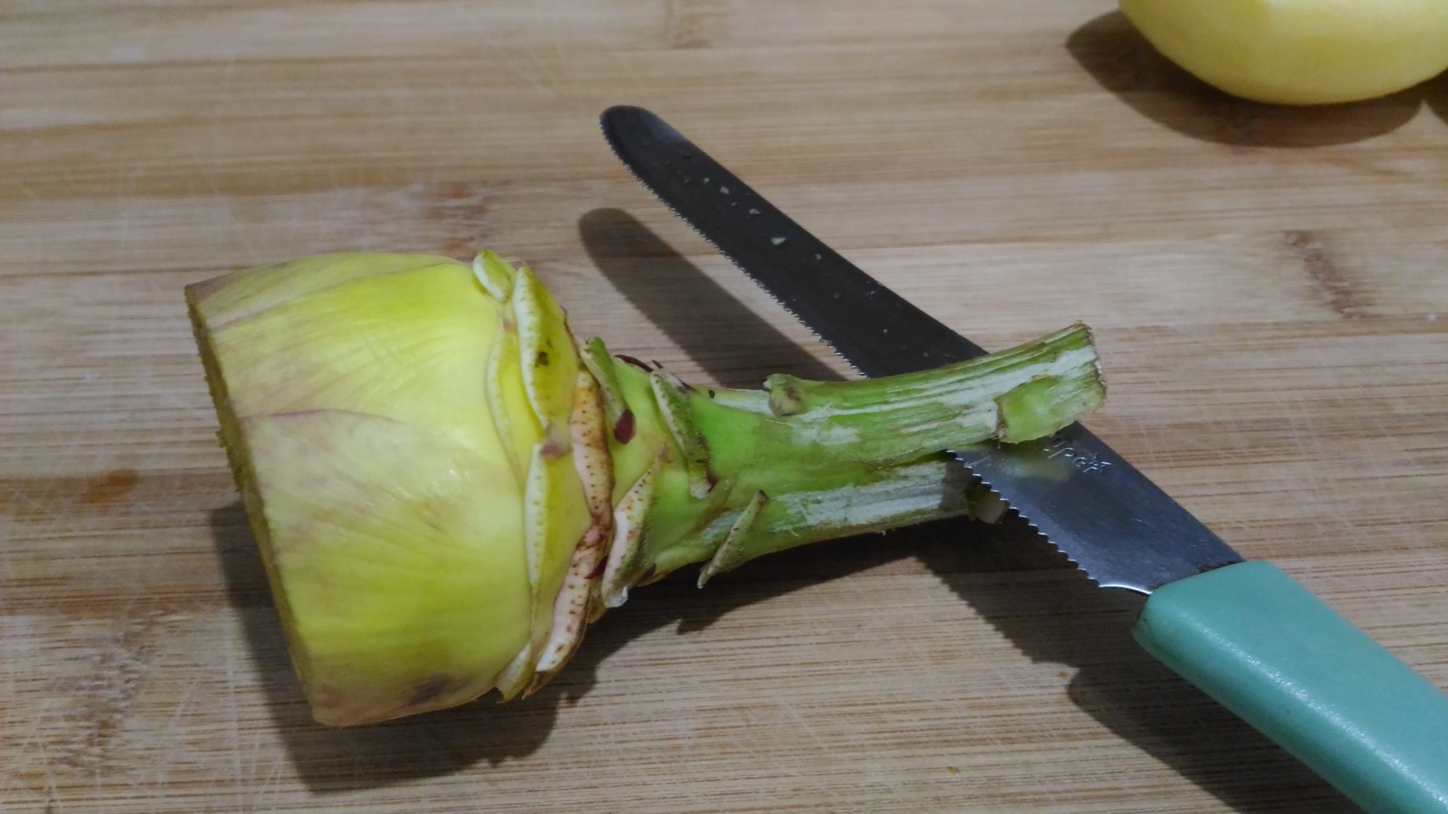 Tagliare il gambo alla base del carciofo in modo che possa stare in piedi nella pentola