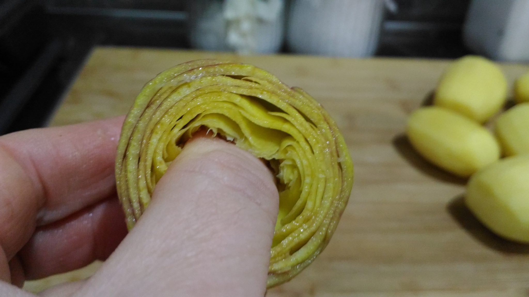 Con i pollici delle mani, allargare il centro del carciofo in modo che possiamo mettere dentro una buona quantità di farcia
