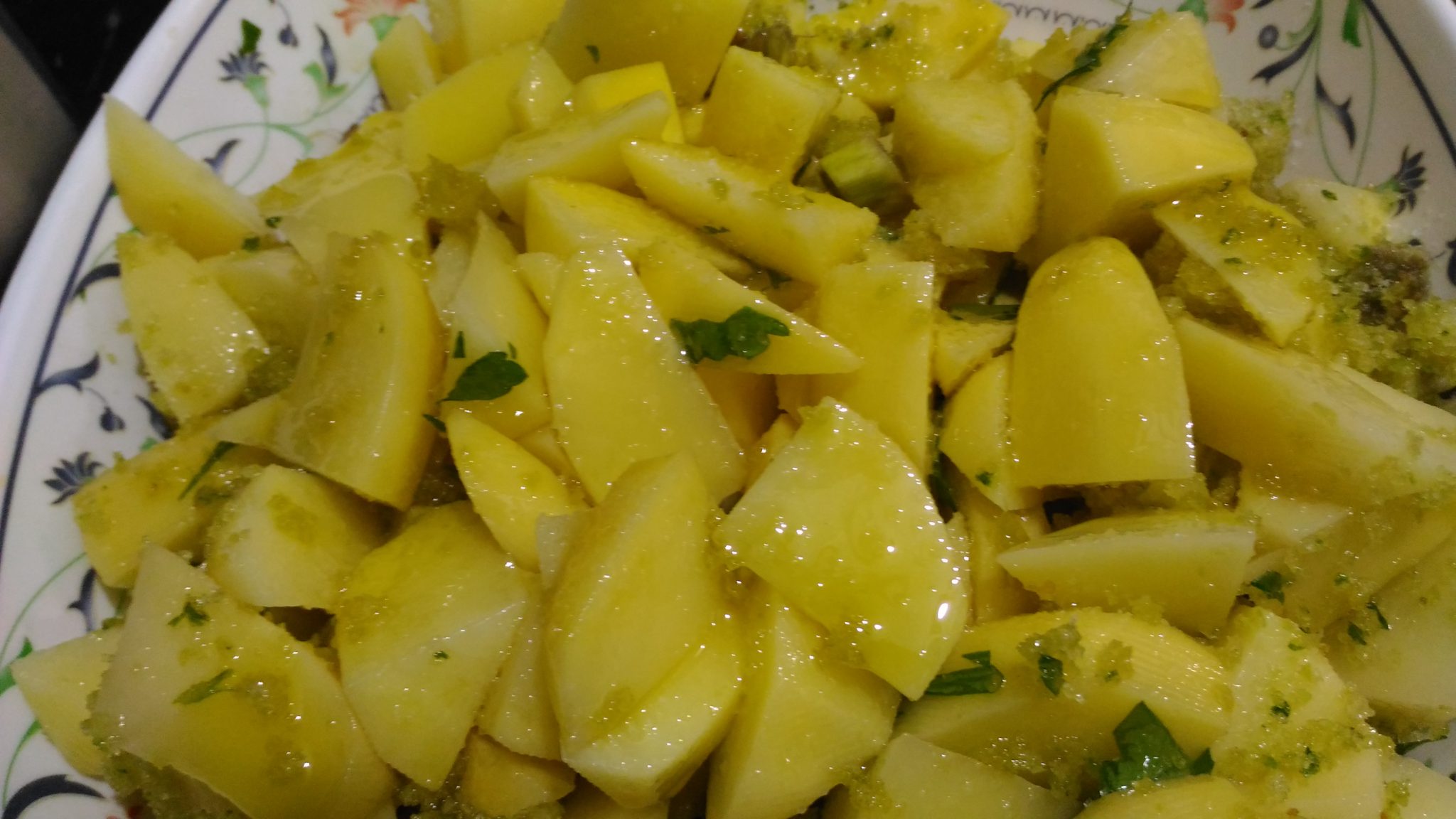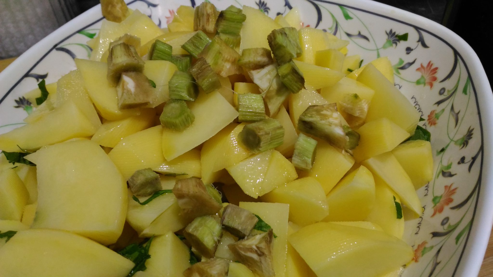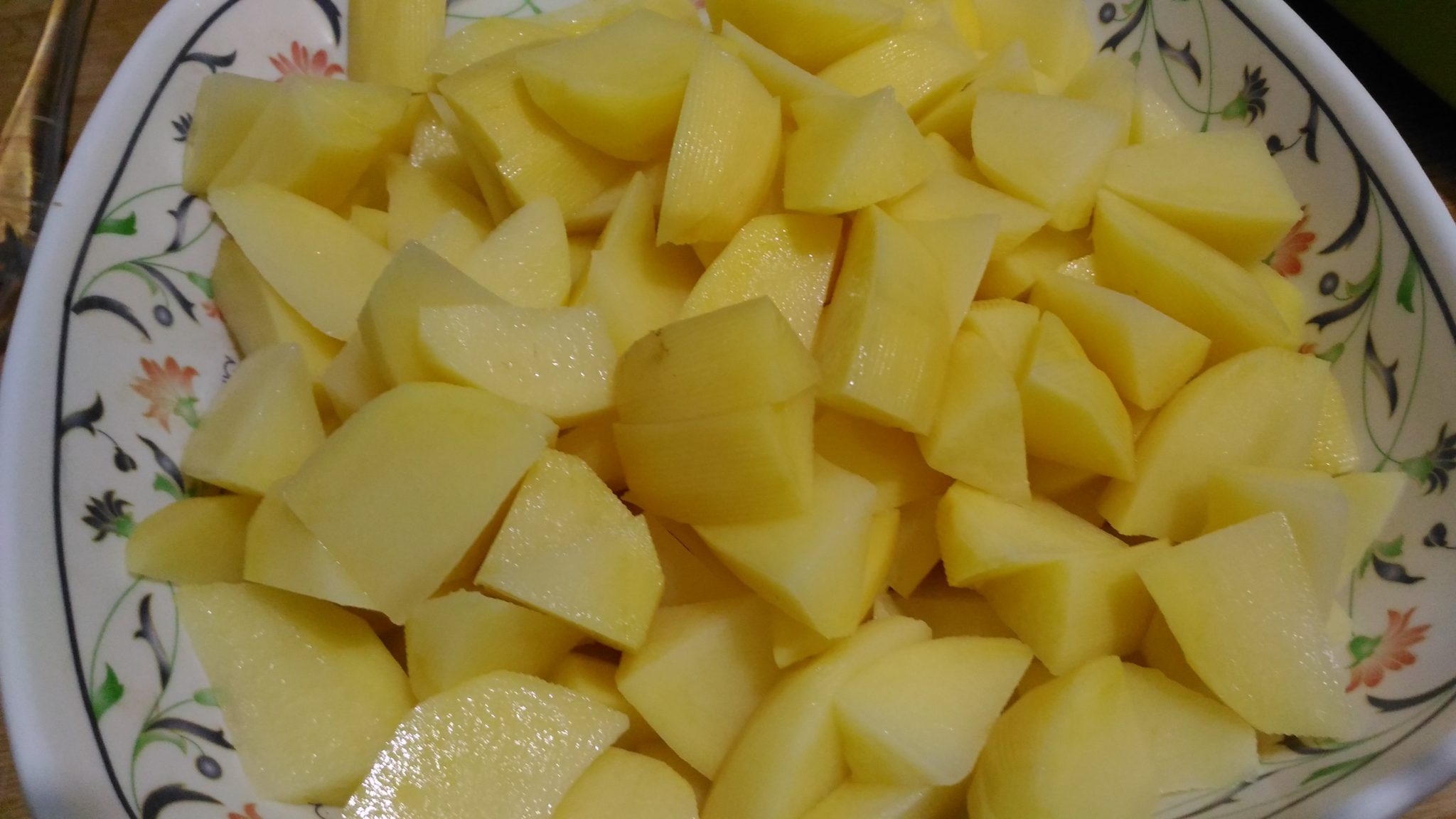 Adesso passiamo alle patate, pelarle e tagliarle a tocchetti, metterle in un recipiente