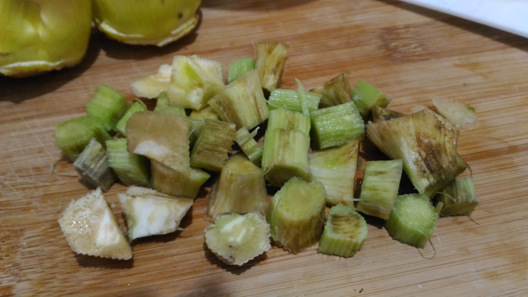 Tagliare a tocchetti i gambi dei carciofi che abbiamo tolto in precedenza