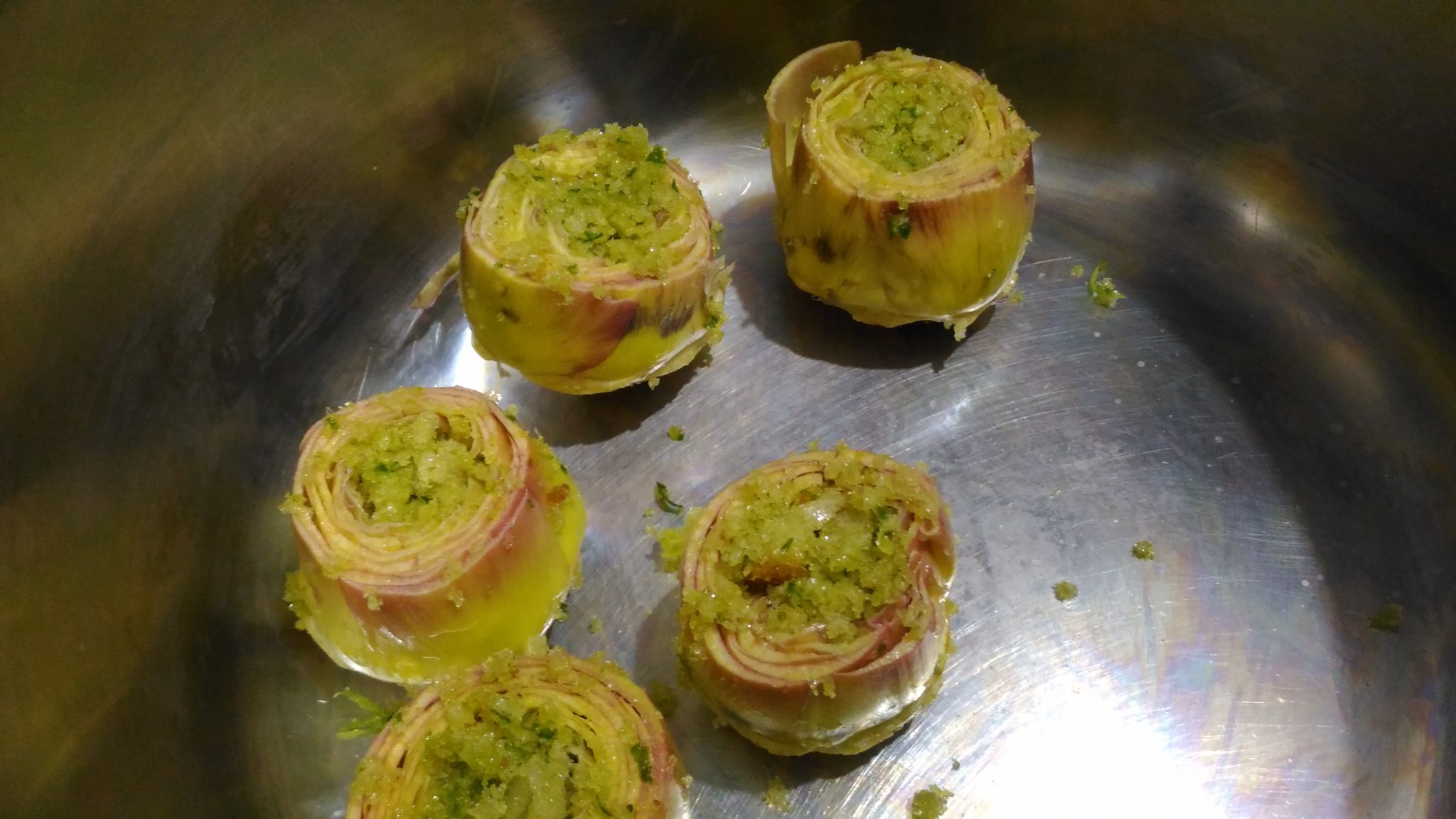 Riempire i carciofi con la farcia preparata e metterli in un tegame alto a testa in su