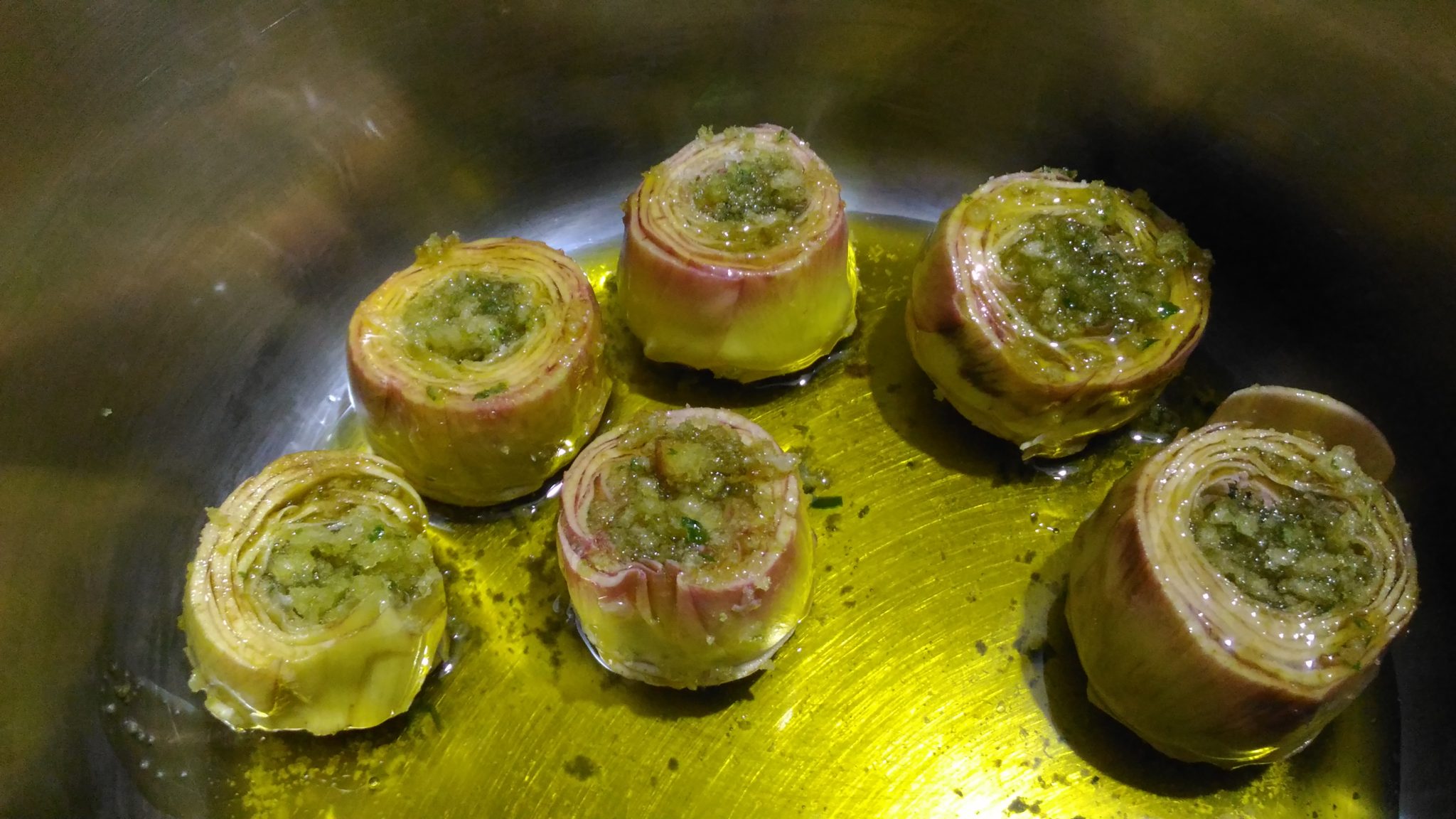 Aggiungere un bel po’ di olio ai carciofi nella pentola e salarli