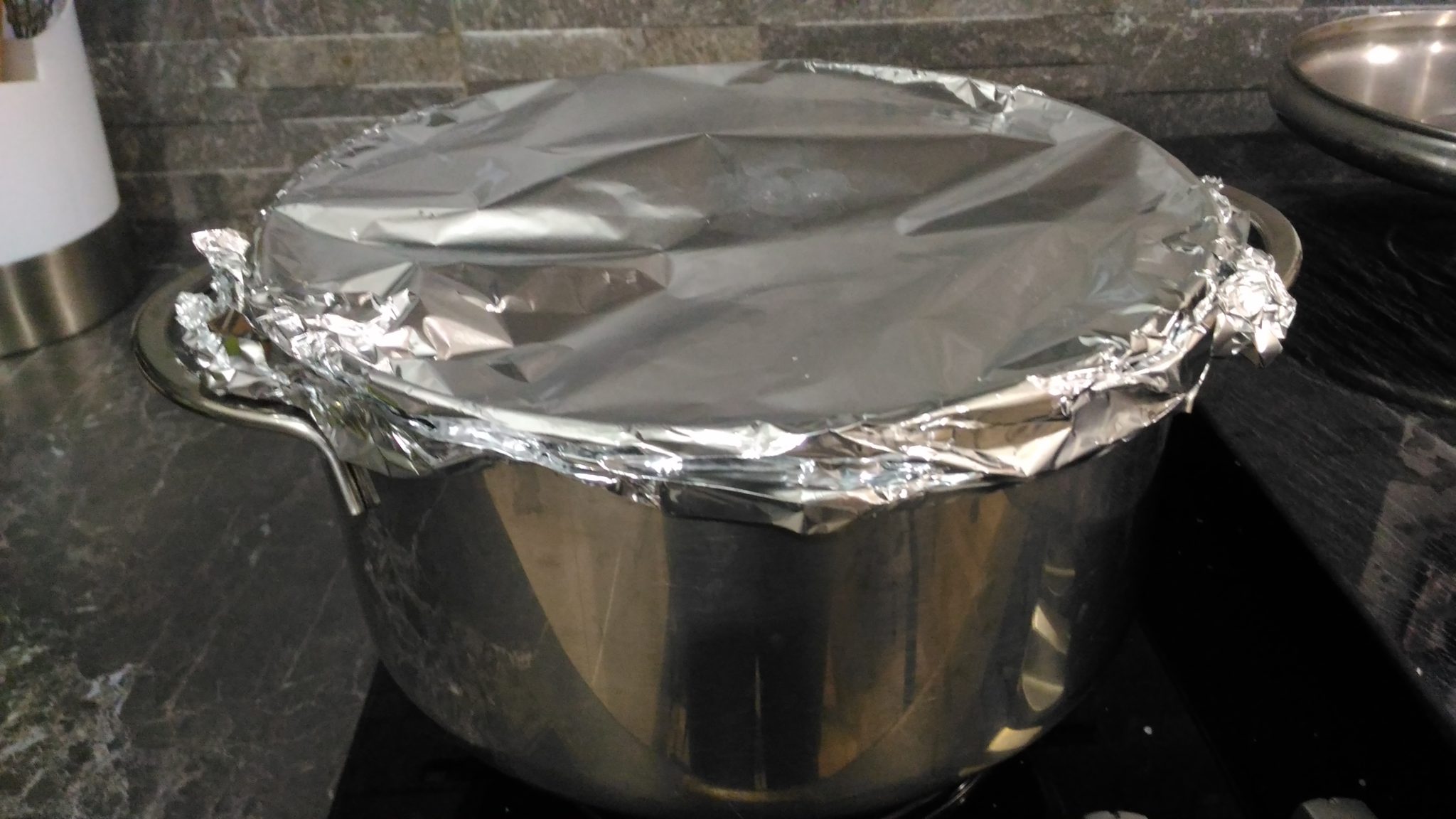 Coprire il tegame con la carta alluminio, cuocere a fuoco medio alto per i primi 5/8 minuti poi abbassare la fiamma e cuocere per altri 20 minuti senza mai aprire