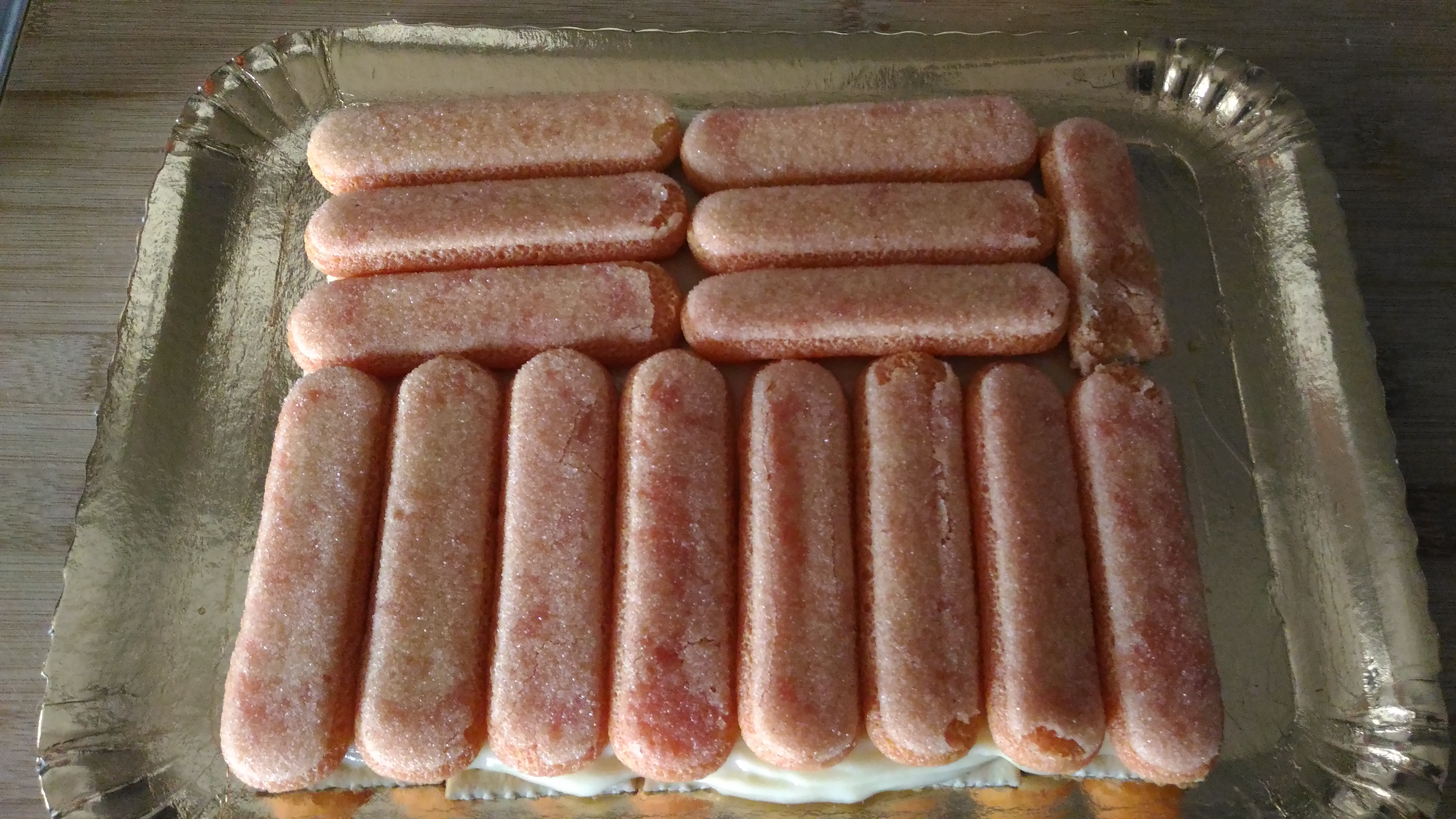Bagnare i 15 savoiardi nell’alkermes diluito e adagiarli sulla crema.
