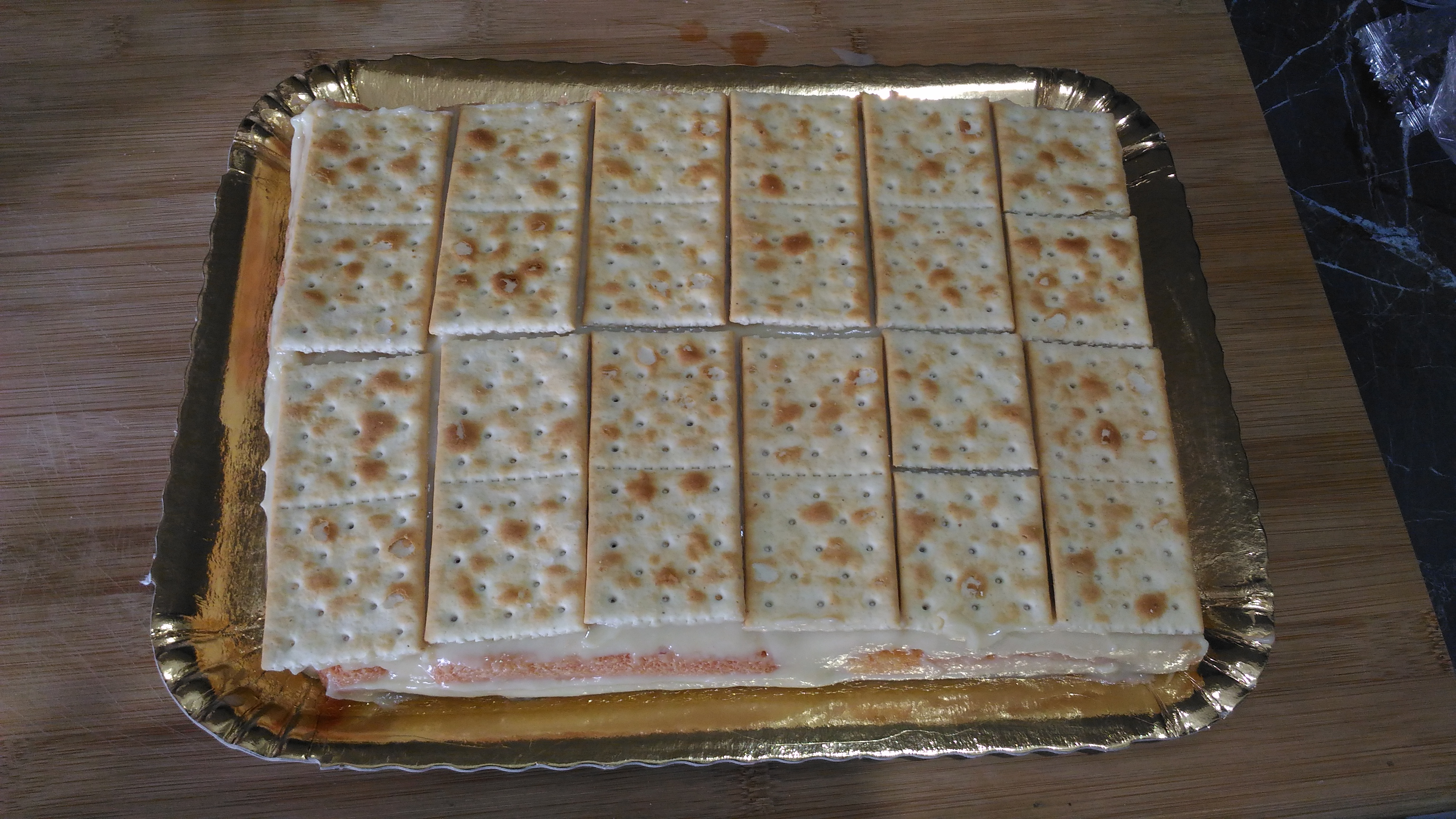 Per fare il finto diplomatico, per prima cosa adagiare 10 crackers non salati su un vassoio rettangolare( io ho usato uno di cartone)