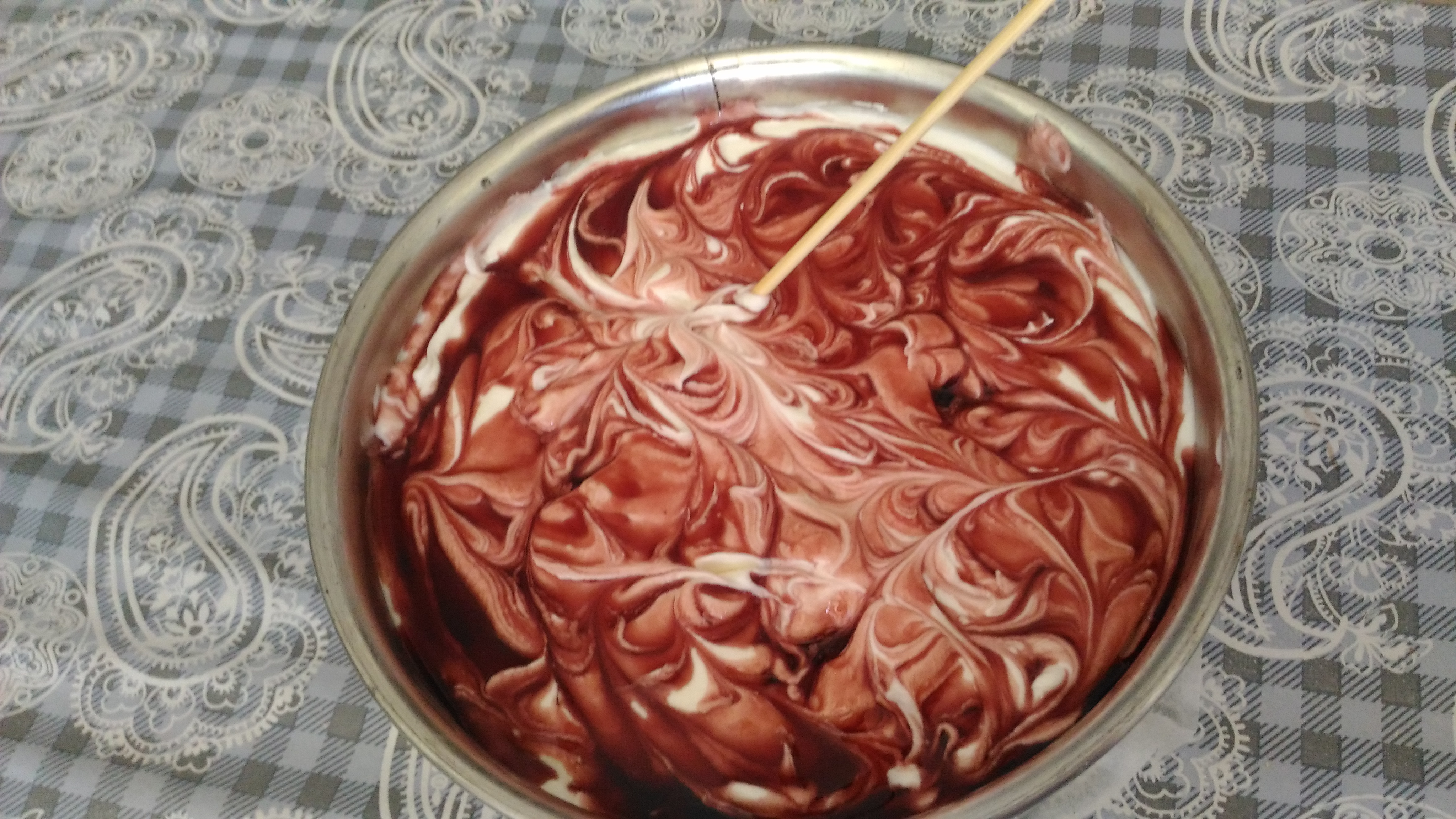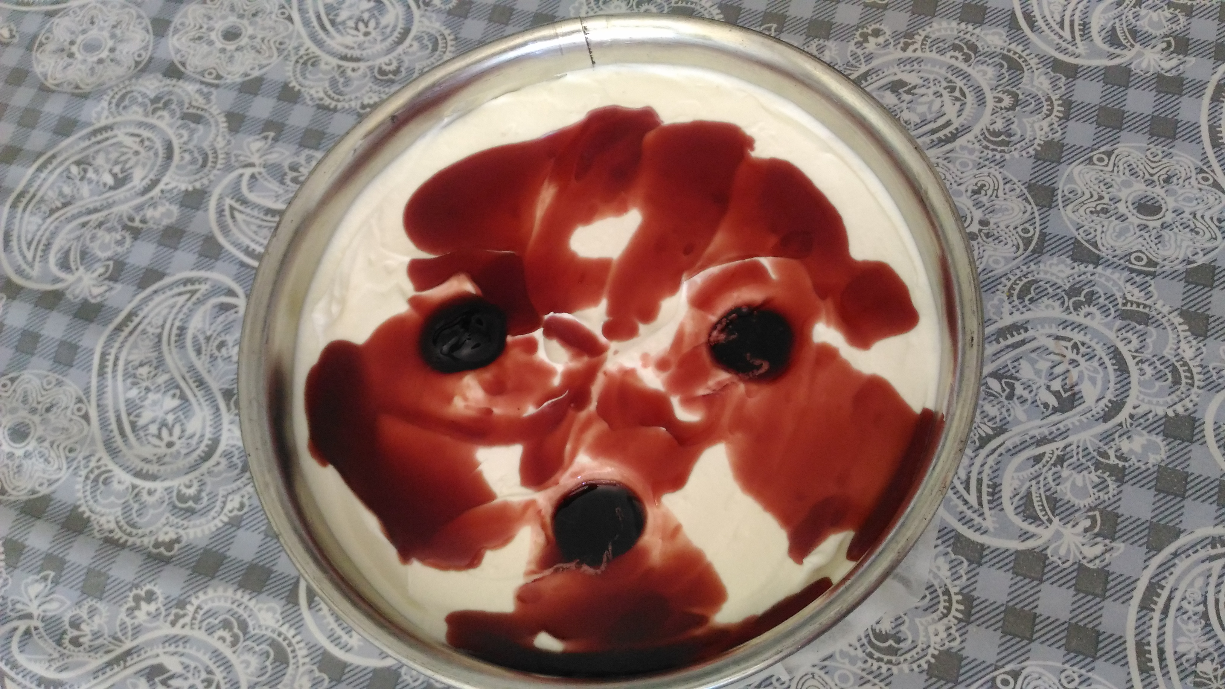 Con uno stecchino di legno o uno spiedino sempre di legno, fare dei disegni astratti in modo che le amarene e lo sciroppo si uniscano alla crema di mascarpone ,panna e latte condensato.