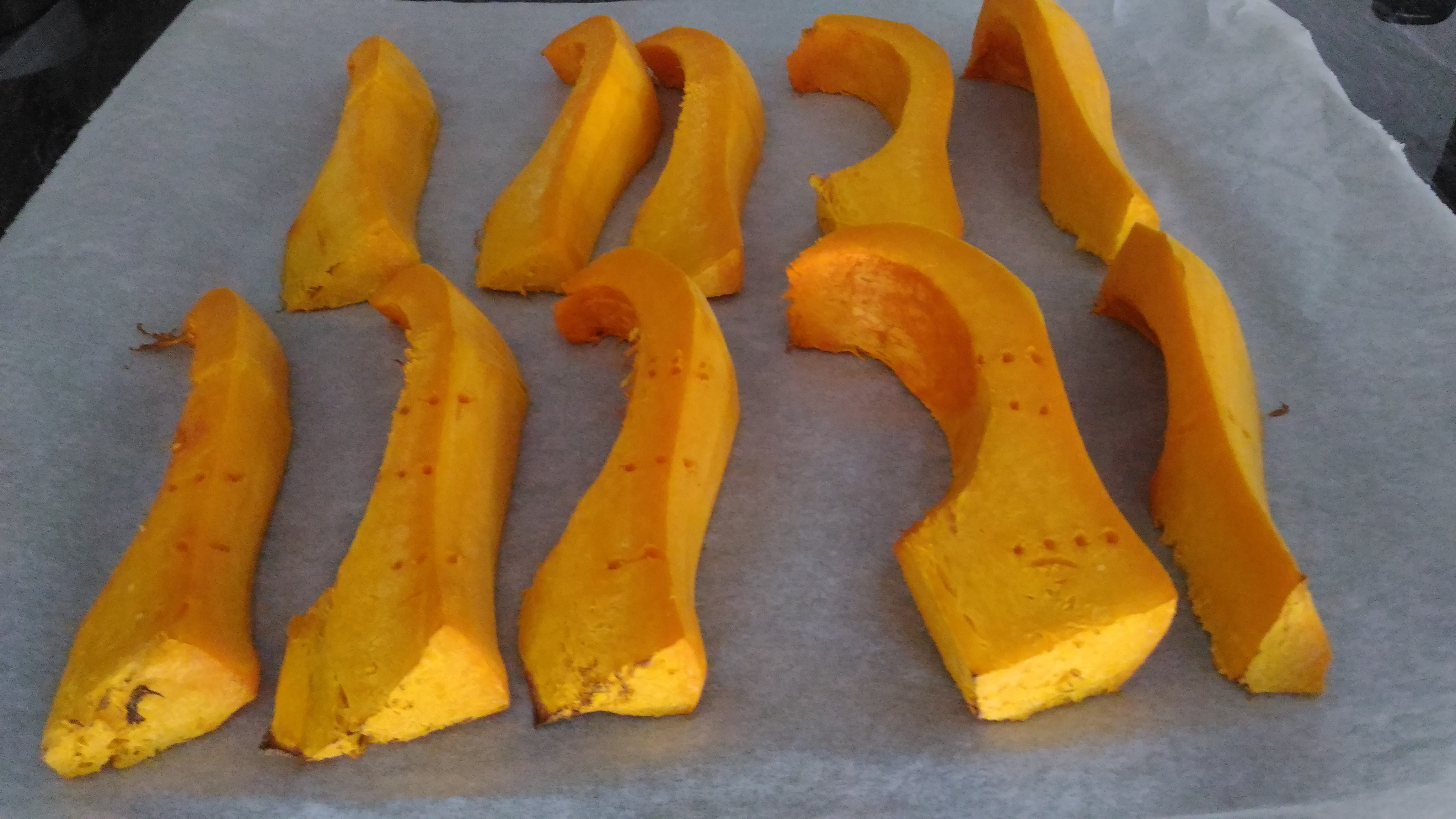 Per preparare la torta zucca e amaretti, prima di tutto tagliare la zucca a fette con tutta la buccia e metterla su un foglio di carta forno e cuocere in forno per circa 30 minuti.