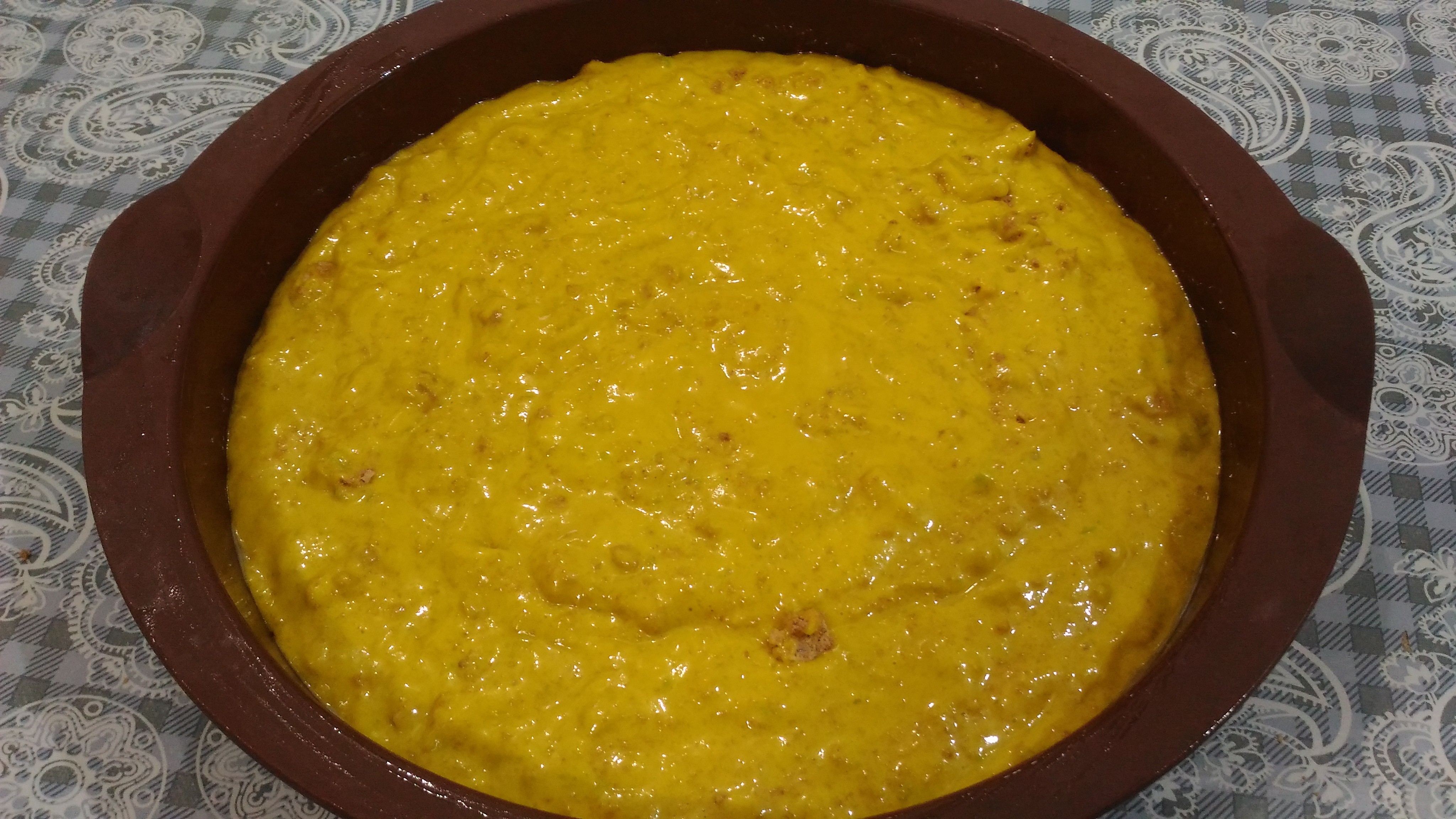 Imburrare uno stampo da torta (io ho usato uno da cm 26 in silicone) e mettere il preparato.